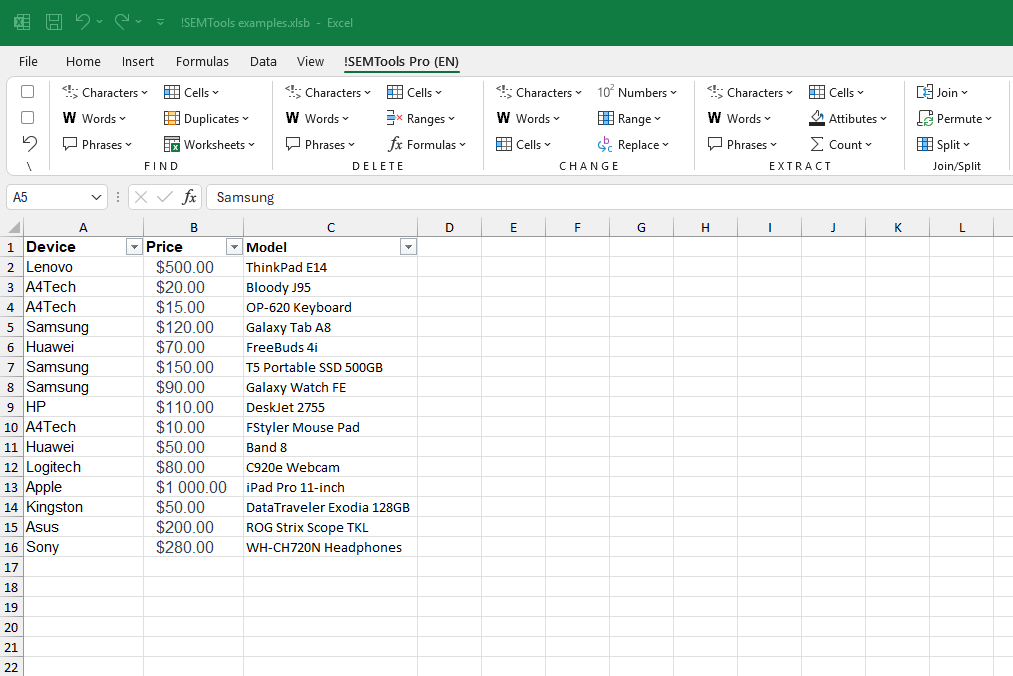 - Remove all duplicate device names except the first one (which, after the sort, represents that brand’s most expensive product).