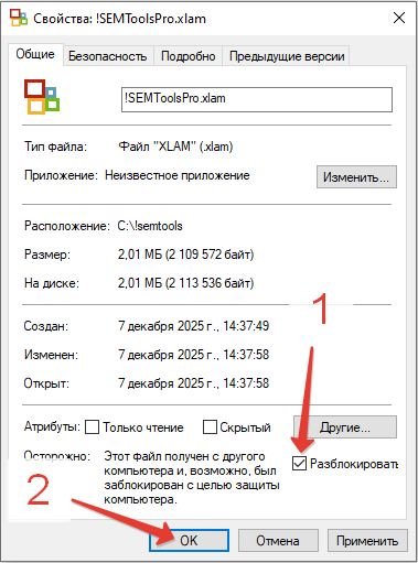 Келісім бойынша Windows интернеттен жүктеп алынған файлдарды блокқа қояды, және кейбір жағдайларда қосылғаннан кейін !SEMTools қосымша беті панельде көрінбей қалуы мүмкін, сол себепті файлды блоктан шығару керек, ол үшін тінтуірдің оң батырмасымен ашамыз.