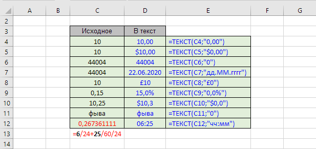 Функция ТЕКСТ конвертирует число в текст в заданном числовом формате.