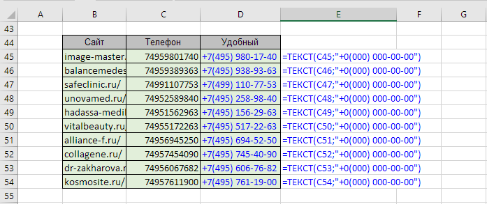 Телефонные номера клиентов хранятся в базе данных в нормализованном виде, безо всяких разделителей и символов. Для удобства ручного прозвона базы руководитель отдела продаж использовал пользовательский формат номера в функции ТЕКСТ.