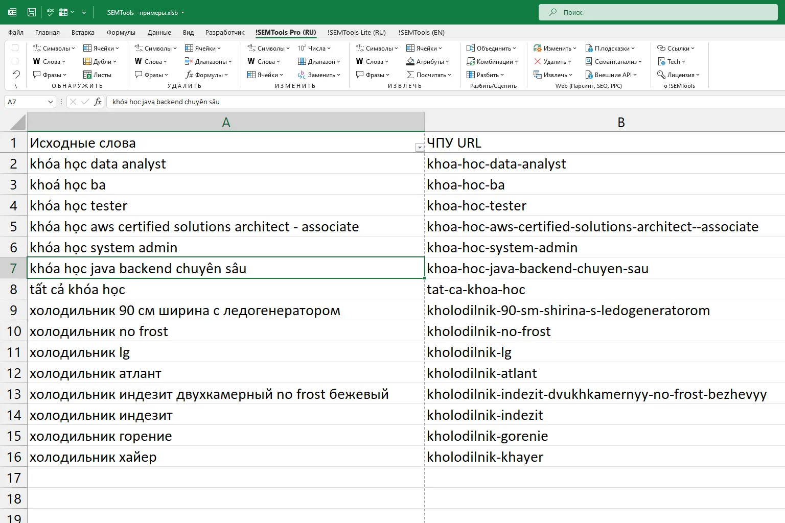“Генератор ЧПУ” в надстройке !SEMTools для Excel автоматизирует процесс создания таких универсальных URL, решая основные проблемы, которые могут возникнуть при их генерации.